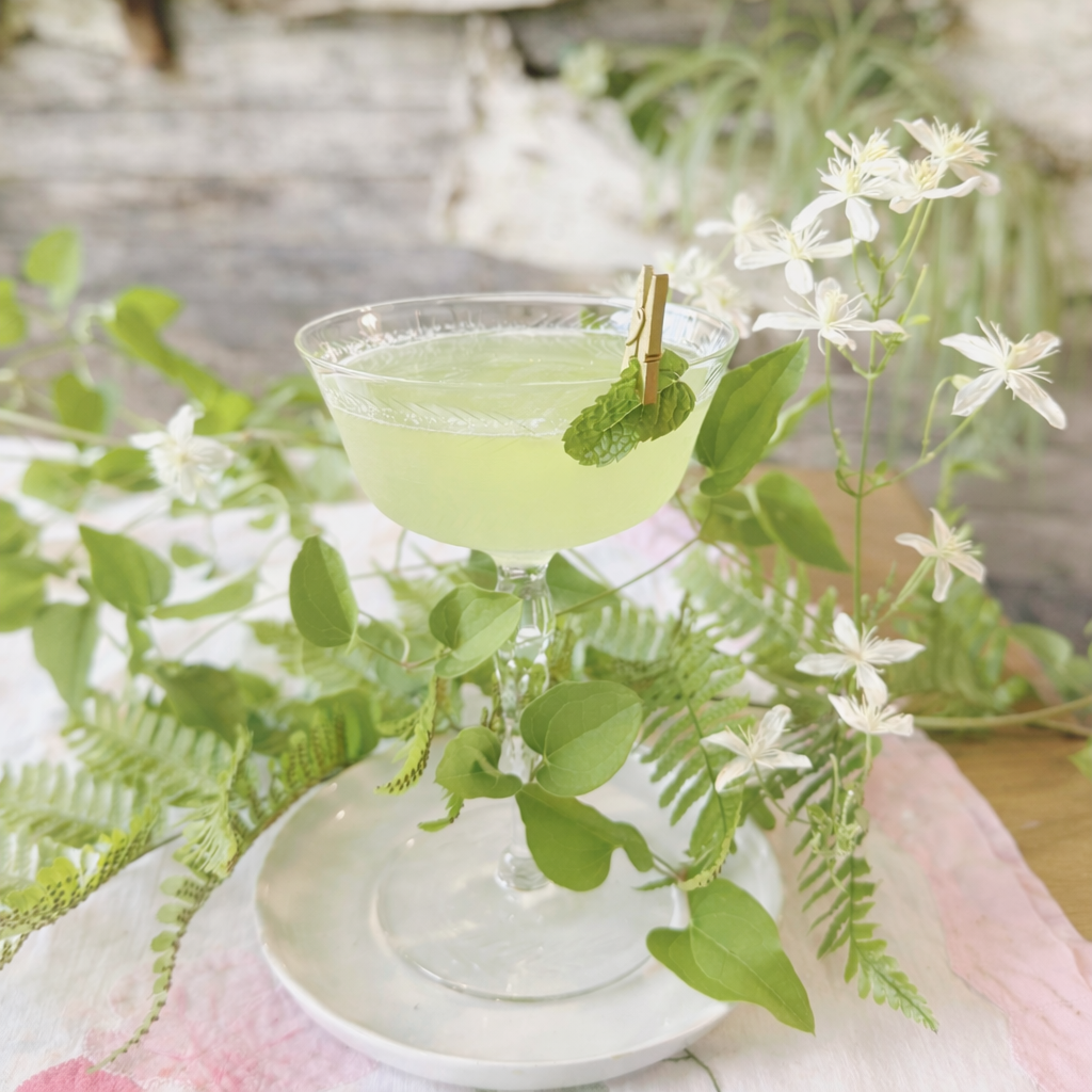 Douel strain into a coupe glass. Garnish with fresh mint.